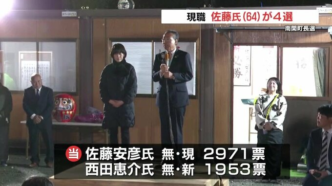 12年ぶりの選挙戦となった南関町の町長選挙は現職の佐藤氏が、新人で前の町議、西田恵介氏(55)を破り、4選を決めました。
