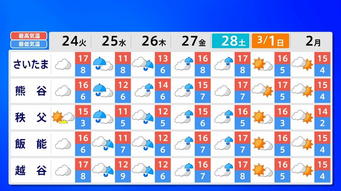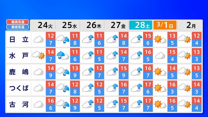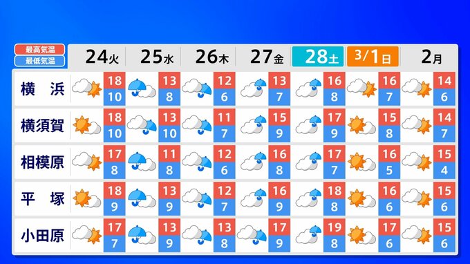 25日(水)と26日(木)は、「寒の戻り」で、23日(月)と比べ10℃ぐらい気温が下がるでしょう。また3月1日(日)の東京マラソンの日は、「晴れ ときどき くもり」の予報となっています。