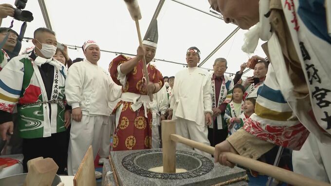 3月1日の「国府宮はだか祭」を前に重さ約4トンの大鏡餅の餅つき “神男”はじめ約2000人が参加 もち米は価格高騰の中 奉賛会が育て66俵分を確保 To view this video please enable JavaScript, and consider upgrading to a web browser that supports HTML5 video CBCテレビ 2026年2月23日(月) 12:20 国内 3月1日に行われる愛知県稲沢市の国府宮はだか祭を前に、奉納される「大鏡餅」の餅つきが北名古屋市で行われています。 国府宮はだか祭で奉納される「大鏡餅」は、周辺の地域の奉賛会が持ち回りで作っていて、ことしは北名古屋市が担当します。