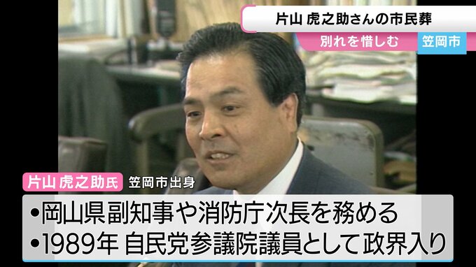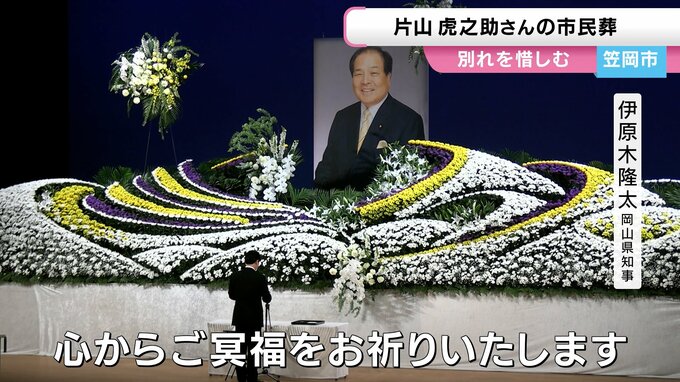 去年12月に90歳で亡くなった、笠岡市出身の政治家・片山虎之助さんの市民葬が、きのう、片山さんの故郷・笠岡市で開かれました。市民葬には、地域の人や政治関係者など生前に親交のあった約400人が参列しました。