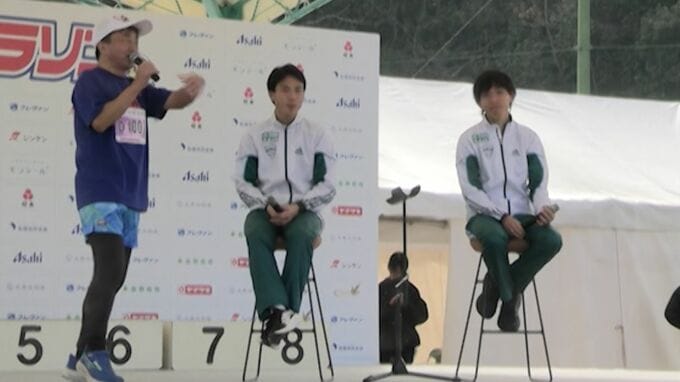 動画配信をしながら沿道の声援にこたえる朝日選手もゴールをめざします。タイムは1時間18分10秒で大学最後のレースを30位で終えました。