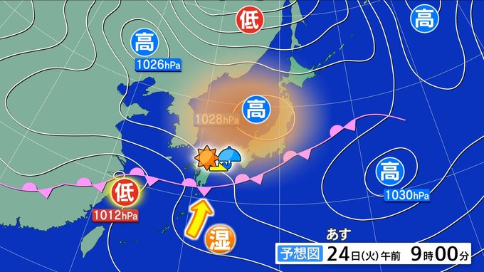 午前中は高気圧の圏内で晴れ間が広がりますが、本州の南には前線がのび、低気圧や前線に向かって暖かく湿った空気が流れ込みやすくなります。昼前からだんだんと雲に厚みが増していくでしょう。はやければ夕方から雨が降り始め、夜には広く本降りの雨になるでしょう。あさってにかけて雨脚の強まる時間帯もある見込みで市。あすの朝は雨具を忘れずにお持ちください。
