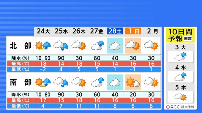 今週は周期的に天気が変化するでしょう。あすの夕方から水曜日にかけて本降りの雨になり、木曜日は回復しますが、金曜日の日中から土曜日の朝にかけては再び雨が降る見込みです。3連休と比較すると気温は控えめですが、それでも高温傾向は続きます。雨上がりは花粉の飛散量が増加するためご注意ください。
