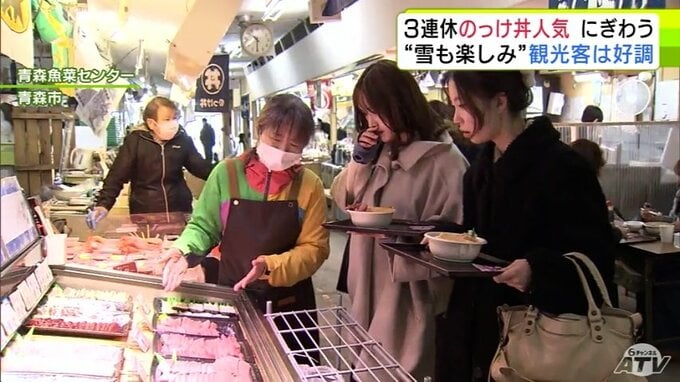青森市の中心部にある青森魚菜センターには国内外から多くの観光客が訪れ、好みの具材を選んで盛り付ける「のっけ丼」を楽しんでいました。