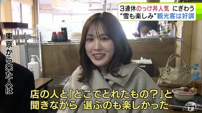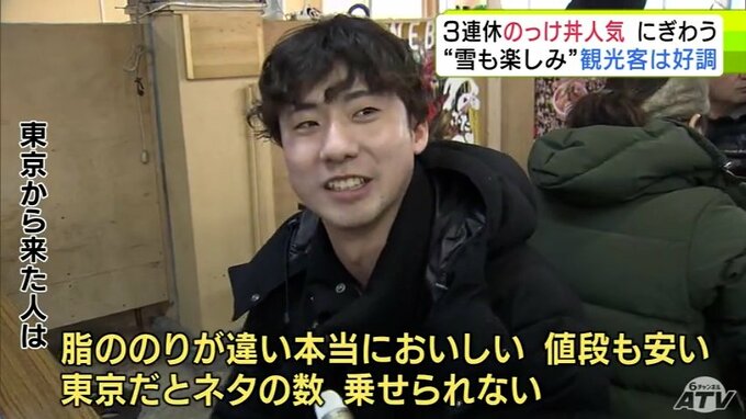 "青森のっけ丼"漁菜センター 大雪による冷え込み心配されるも 観光・週末客は平年比2割増し 3連休賑わう「雪はそんなに関係ない」 観光客は雪も観光の1つとして楽しみに「東京だと(この値段で)このネタの数は乗せられない」 3時間前