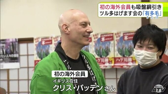 「ハゲに国境はない!ハゲよーい…のこった」磨きをかけた自慢の頭で吸盤綱引き 今年はイギリスから初の海外会員が参戦 オリンピックに負けない熱戦 輝く頭で世の中を明るく照らす " ツル多はげます会 新春の有多毛"「つるつるつるの日」 青森県 青森テレビ 2026年2月23日(月) 20:55 国内 このうち史上初、海外の新会員として参加したのはイギリス在住で、町内に住む娘と会うために来日したクリス・パッテンさんです。 パッテンさんはツル多はげます会恒例の吸盤綱引きで初陣に臨みました。