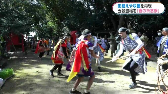 五穀豊穣を願って田植えから収穫までを再現したユニークな劇を地元住民が披露したほか、伝統の「鎌踊り」が奉納されました。