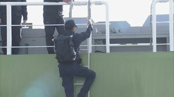 「きのうに引き続き、運輸安全委員会の調査官が貨物船の中に入っていきます」