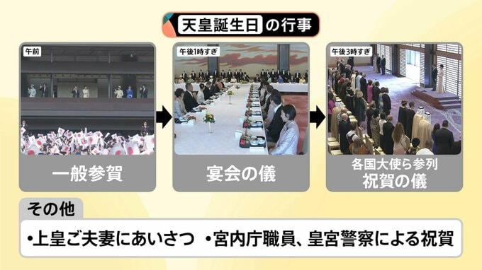 天皇誕生日の行事として、▼午前には「一般参賀」、▼午後1時過ぎからは高市総理や皇族方が集まる昼食会「宴会の儀」、▼午後3時過ぎからは各国の大使らが参列する「祝賀の儀」が執り行われます。そのほか、上皇ご夫妻へのあいさつや、宮内庁職員、皇宮警察による祝賀も予定されています。