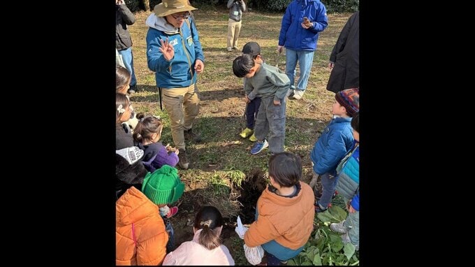 「森の探検」の時間になると、birthのレンジャーが希望者を集め「ここで暮らした人たちが思いを込めて植えた木々の下には、様々な植物、そして、様々な生きものが集まってきます」と説明を始めました。