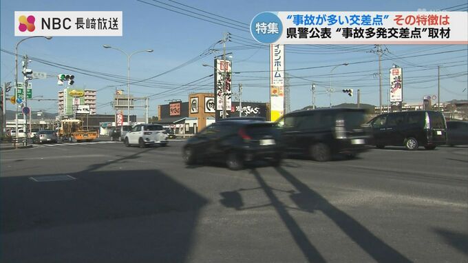 NBC佐野記者:「諌早市貝津町の交差点です。交通量が多いことに加えて右折レーンが2車線あり、かなり複雑なつくりとなっています」