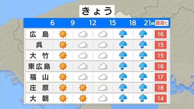 週末の暖かさと比べて、冷え込みをより感じた人が多かったかもしれません。それでも日中の気温は広島16℃・呉15℃・福山17℃・庄原18℃予想で、春の陽気が続くでしょう。