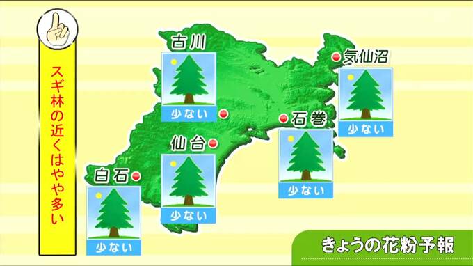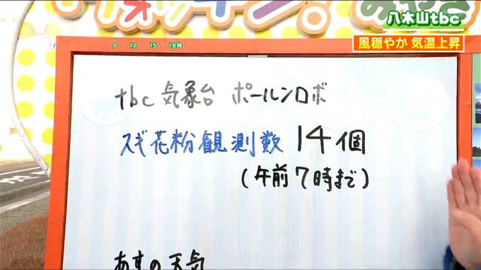 また、TBC気象台のポールンロボでは、午前7時までにスギ花粉が14個観測されました。この時期としては観測ペースが早い方で、杉林の近くでは飛散量が少し多くなるところも出てくるかもしれません。