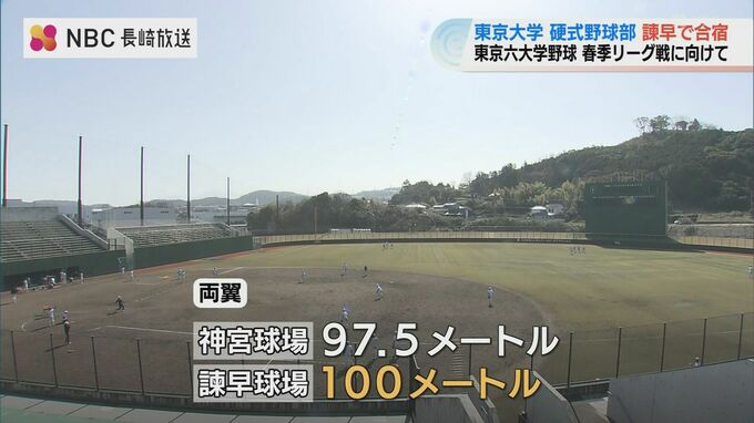東大の練習場はホームベースからレフト・ライトスタンドへの距離が90メートルに満たず、広さが十分に確保できないという悩みがあります。リーグ戦が行われる明治神宮野球場と同規模の施設を求めていたチームにとって、諫早の環境は理想的だったといいます。