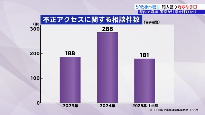 こうしたSNSの乗っ取りなどを含む不正アクセスに関係する県警への相談件数は2024年が前の年を100件上回る288件、2025年上半期は前の年の同じ時期と比べて56件多い181件と増加しています。