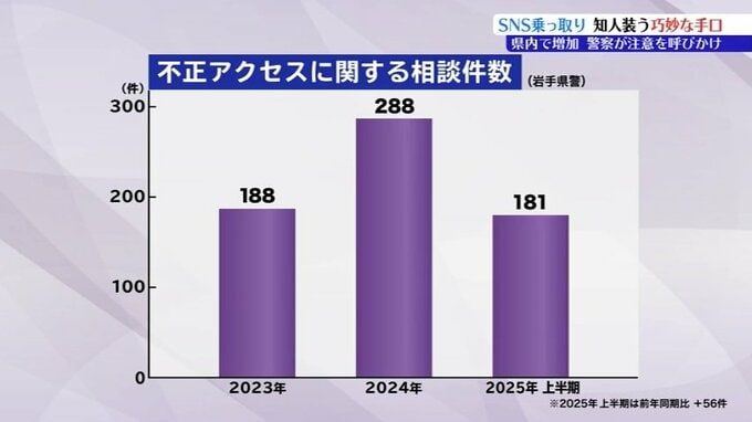 こうしたSNSの乗っ取りなどを含む不正アクセスに関係する県警への相談件数は20204年が前の年を100件上回る288件、2025年上半期は前の年の同じ時期と比べて56件多い181件と増加しています。