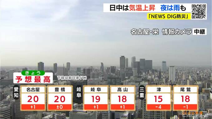 最高気温は名古屋や豊橋で20℃、岐阜で19℃、津では15℃の予想で、日中は各地で春本番の陽気になるでしょう。夜もあまり気温が下がらず、暖かさが続く見込みです。