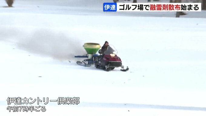 北海道伊達市のゴルフ場では、今シーズンのオープンに向けて融雪剤の散布が始まりました。真っ白いゴルフコースに散布されているのは、太陽光の熱で雪をとかす木炭の融雪剤です。伊達カントリー倶楽部では雪解けを…