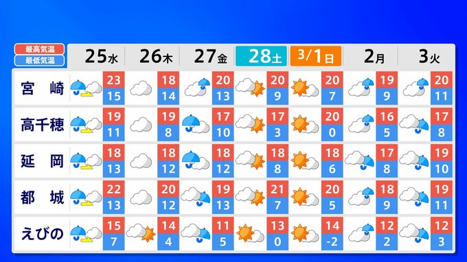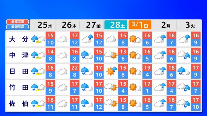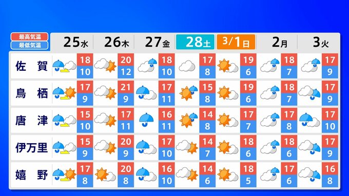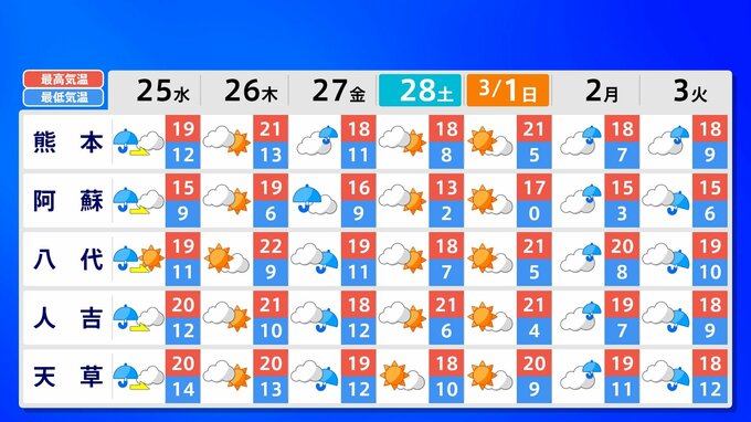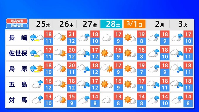九州地方 各都市の週間予報(25日(水)~ 3月3日(火))