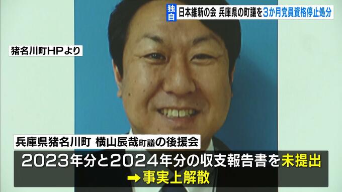 地方議員などの政治団体が、政治資金収支報告書を2年続けて提出せず解散させられていた問題で、日本維新の会は、所属する兵庫県の町議会議員を3か月の党員資格停止処分としたことが分かりました。