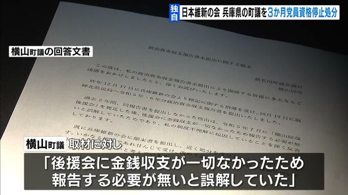 【独自】日本維新の会が兵庫県の町議を3か月の党員資格停止処分 政治資金収支報告書の未提出問題 町議「金銭収支が一切なく、報告の必要無いと誤解」 毎日放送 2026年2月24日(火) 12:27 国内 ▼横山町議「報告する必要が無いと誤解していた」 横山町議は取材に対し、「後援会に金銭収支が一切なかったため、報告する必要が無いと誤解していた」「去年12月に報告書を提出した」としています。