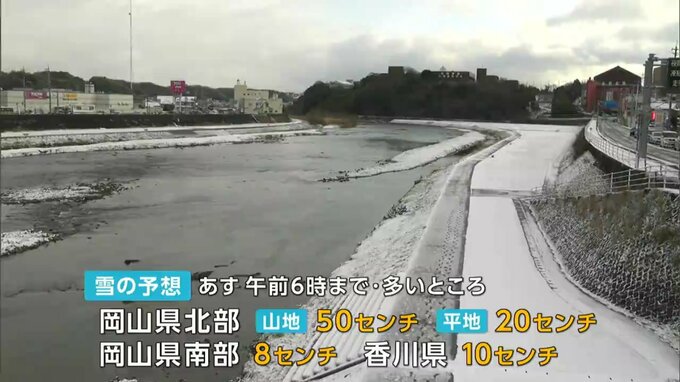 今後も山沿いを中心に雪が降る見込みで、あす(24日)午前6時までの24時間の予想降雪量は、岡山県北部の山地の多い所で50センチとなっています。気象台では路面の凍結やビニールハウスといった農業施設の管理などに注意を呼びかけています。