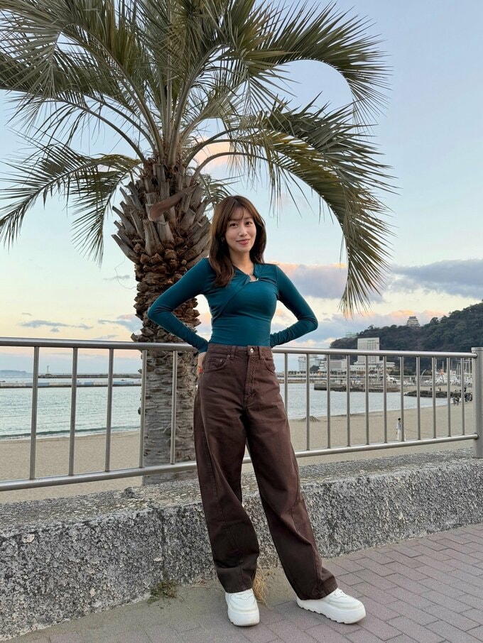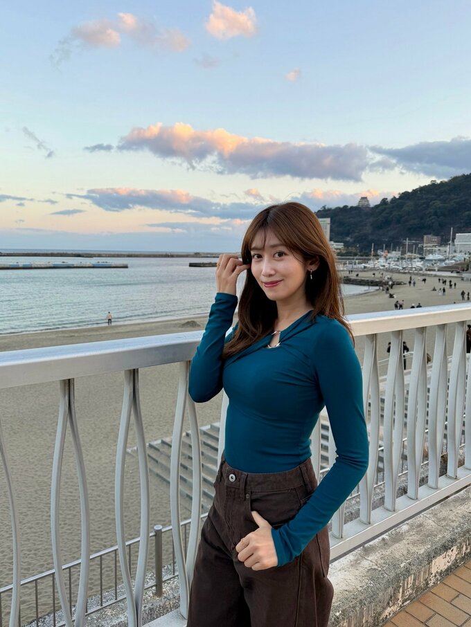 中川安奈さんは「熱海サンビーチ」と綴ると、海辺で佇む写真などをアップ。