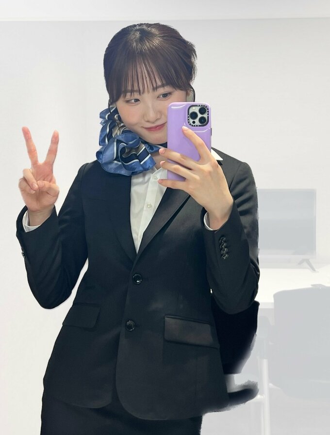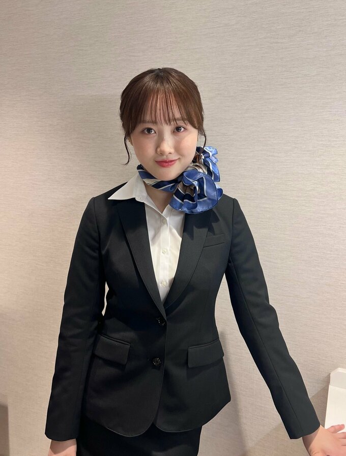黒いスーツに身を包んだ本田さんは、鏡の前でVサインを作り、穏やかな微笑みを浮かべる姿を披露。黒のジャケットスーツに白いシャツ、青いスカーフという航空会社の客室乗務員の制服を彷彿とさせる装いで、「CAさんになりました(?)」とユーモアを込めた一言を添えています。