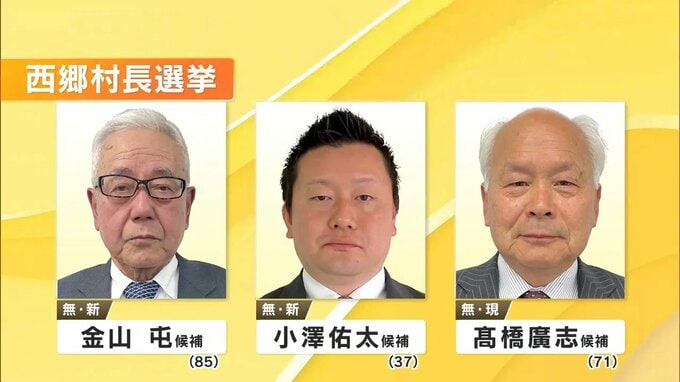 西郷村の村長選挙に立候補したのは、届け出順に、いずれも無所属で、新人で自営業の金山屯さん(85)、新人の元村議会議員・小澤佑太さん(37)、現職で3期目を目指す高橋廣志さん(71)の3人です。