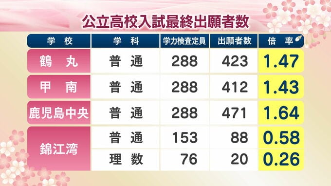 鹿児島県公立高校入試最終倍率【全校掲載】高倍率は玉龍、鹿児島中央、鹿児島南(体育)、鶴丸、甲南【令和8年度高校受験志願倍率と出願者数】2026最新 南日本放送 2026年2月24日(火) 14:35 国内 鹿児島学区 鹿児島学区は鶴丸、甲南、鹿児島中央、錦江湾、武岡台、開陽、明桜館、松陽、鹿児島東、鹿児島工業、鹿児島南、吹上、伊集院、市来農芸、串木野、鹿児島玉龍、鹿児島商業、鹿児島女子です。