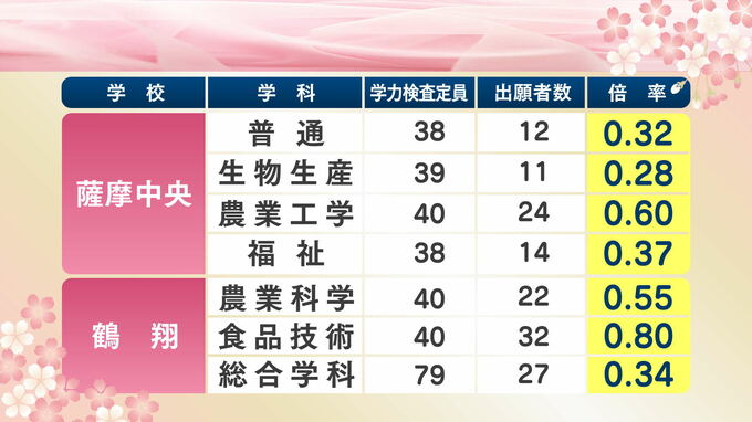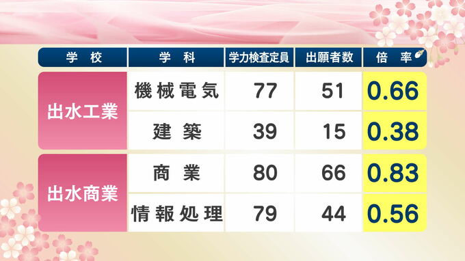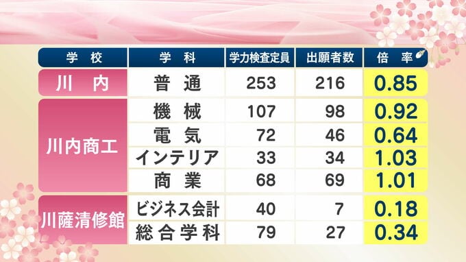 鹿児島県公立高校入試最終倍率【全校掲載】高倍率は玉龍、鹿児島中央、鹿児島南(体育)、鶴丸、甲南【令和8年度高校受験志願倍率と出願者数】2026最新 南日本放送 2026年2月24日(火) 14:35 国内 北薩学区 川内、川内商工、川薩清修館、薩摩中央、鶴翔、野田女子、出水、出水工業、出水商業です。