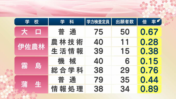 鹿児島県公立高校入試最終倍率【全校掲載】高倍率は玉龍、鹿児島中央、鹿児島南(体育)、鶴丸、甲南【令和8年度高校受験志願倍率と出願者数】2026最新 南日本放送 2026年2月24日(火) 14:35 国内 姶良・伊佐学区の最終出願倍率(最新) 大口、伊佐農林、霧島、蒲生、加治木、加治木工業、隼人工業、国分、福山、国分中央です。