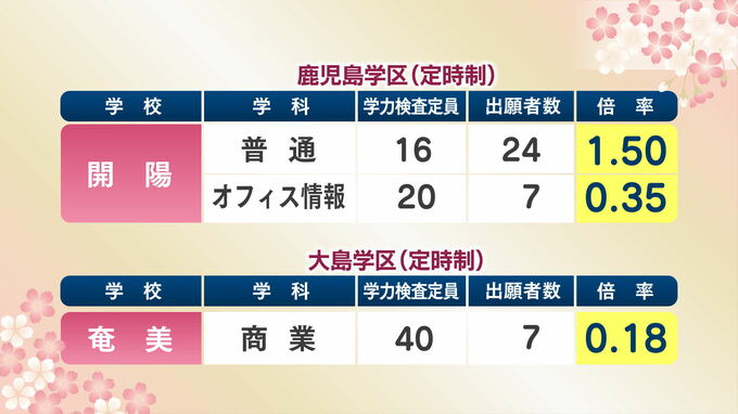 鹿児島県公立高校入試最終倍率【全校掲載】高倍率は玉龍、鹿児島中央、鹿児島南(体育)、鶴丸、甲南【令和8年度高校受験志願倍率と出願者数】2026最新 南日本放送 2026年2月24日(火) 14:35 国内 定時制の最終出願倍率(最新) 開陽、奄美です。 入試は来月4日と5日に行われ、合格発表は来月12日です。