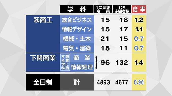 【全校掲載】山口県公立高校入試2026志願倍率発表 全日制は0.96倍 徳山・文理探究(理数)2.1倍 山口・文理探究1.4倍 【2月24日発表】 テレビ山口 2026年2月24日(火) 16:35 国内 萩・普通は0.9倍 萩商工・情報デザインは1.1倍