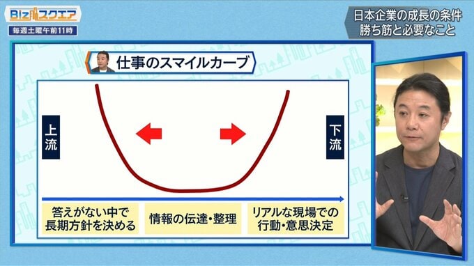 上流・下流は高付加価値・中流は低付加価値となり、グラフが人が笑った口のような形になる