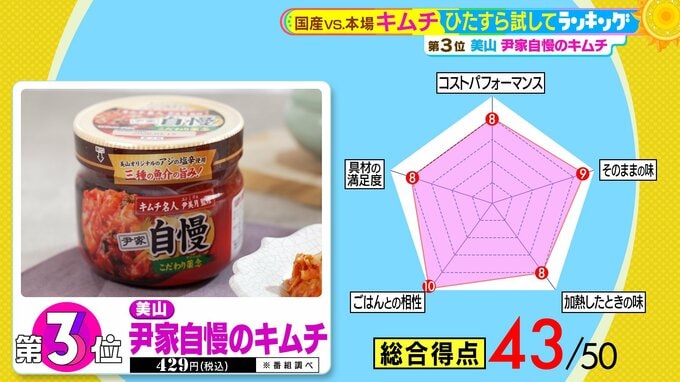 第3位は、美山の『尹家自慢のキムチ』(税込429円 ※番組調べ)。