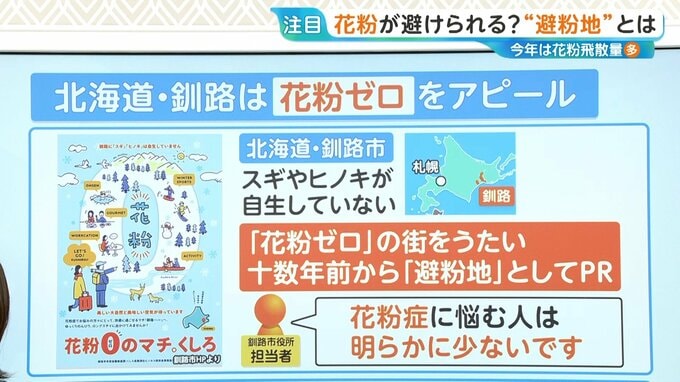 北海道釧路市はスギやヒノキが自生していないことから「花粉ゼロのマチ」をうたい、十数年前から“避粉地”としてPRをしています。