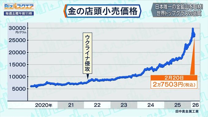 “有事の金”と呼ばれ、安全資産と言われる金の価格は、ウクライナ侵攻が起きた4年前と比べると約4倍に。