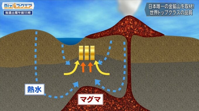 「岩盤の中にパイプが水平に200~300m入っている。そこに金鉱脈があって、金鉱脈の中に溜まっている温泉を抜いている。“温泉のおかげで金鉱脈ができた”」