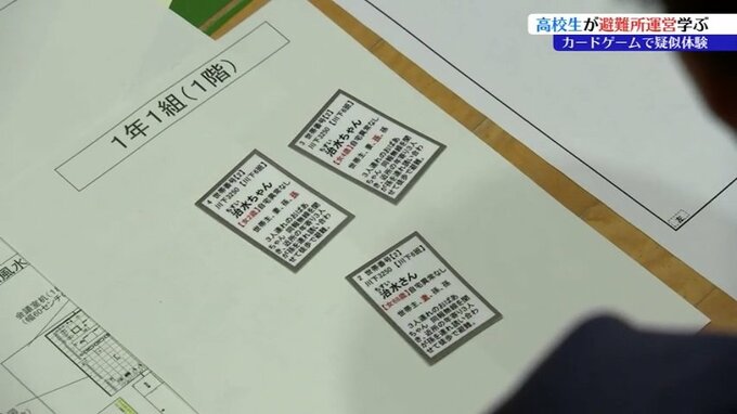 各グループに配布された避難者のカードには、高齢者や妊婦、体調不良の人、ペット連れなどの情報が書かれています。