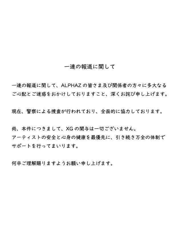 一連の報道に関して、ALPHAZの皆さま及び関係者の方々に多大なるご心配とご迷惑をおかけしておりますこと、深くお詫び申し上げます。