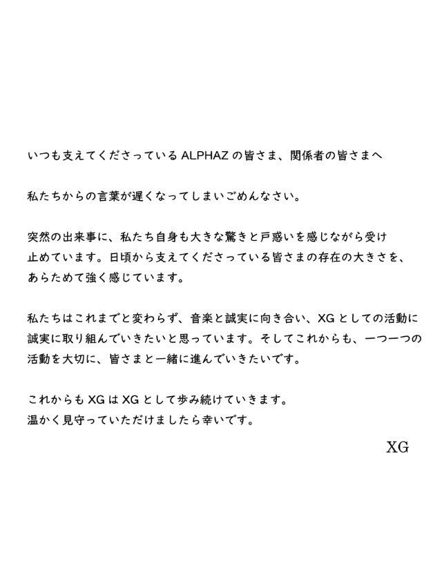 「XG」は、さきほど今回の事件に関する公式なコメントをSNSで下記の通り発表しました。