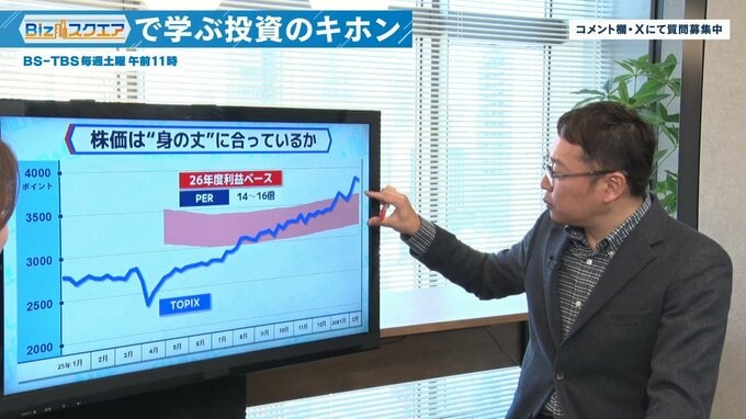 井出さんによると、「26年度の13%増益」を前提とした場合、TOPIXの“高過ぎず安過ぎず”の標準レンジは3000~3500ポイントぐらい。