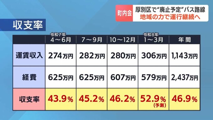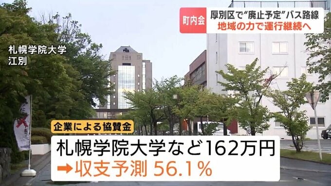 これでは運行継続とならないはずでしたが、春以降、札幌学院大学などによる協賛金が162万円集まることから収支が年間56.1%に改善される見込みです。これで路線バスの運行は、来年度も継続されることが決まりました。
