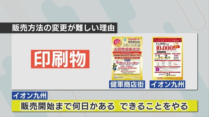 健軍商店街とイオン九州は、それぞれ、プレミアム付き商品券の販売を知らせるチラシが消費者に出回っているため、今から、チラシの記載と大きく異なる販売方法にすることは難しいと話しています。