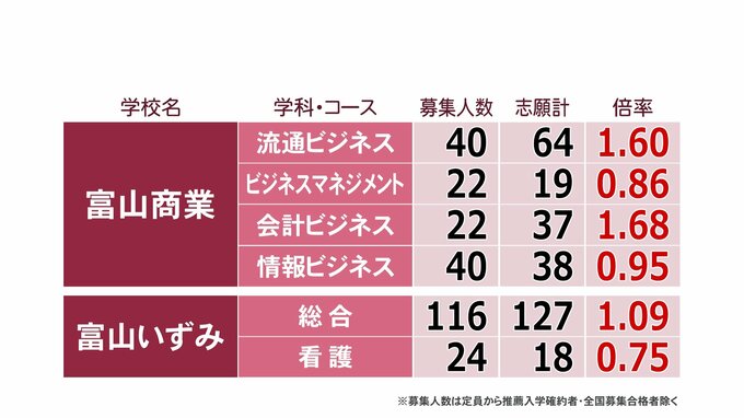 富山商業は会計ビジネス科が1.68倍と、すべての学校で2番目に高くなっています。富山いずみは総合学科が1.09倍です。