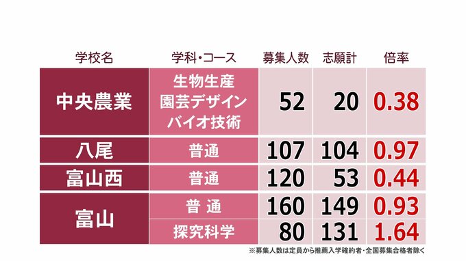 中央農業は0.38倍。八尾と富山西も定員割れです。富山・探究科学科は1.64倍とすべての学校で3番目に高くなっています。
