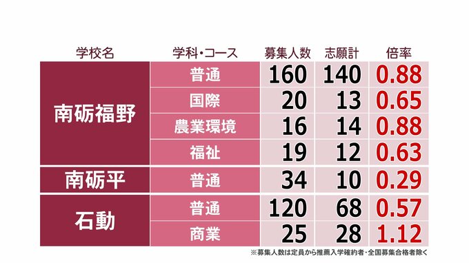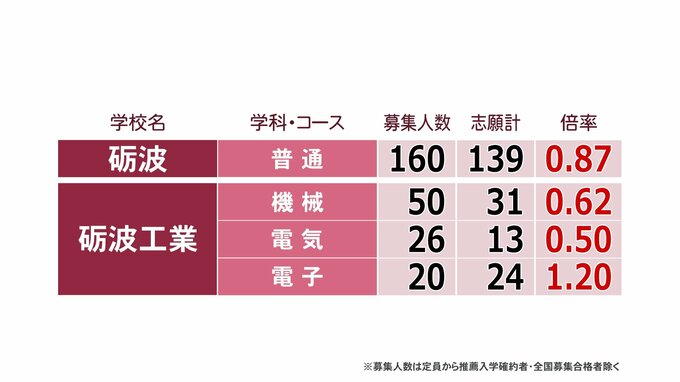 【倍率一覧 富山県】令和8年度(2026年度)県立高校入試 志願倍率全体 0.89倍 富山中部・探究科学科 2.10倍 28校56学科で定員割れ【全校全学科 一覧掲載】 チューリップテレビ 2026年2月24日(火) 17:10 国内 砺波地域 高校志願倍率(全日制課程一般) 砺波・普通科は0.87倍、砺波工業・電子科は1.20倍です。 南砺福野・普通科は0.88倍、南砺平・普通科は0.29倍、石動・普通科は0.57倍などとなっています。
