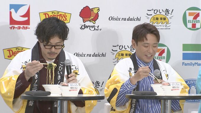 アンバサダーを務める福島県いわき市出身の平子さんは、セブンイレブンで発売される「海鮮の旨み 浜ラーメン」を試食。〝うま!具材いれすぎ!二郎系のもやしくらい(三陸産)わかめが入ってて麺が見えない〟と美味しさを熱弁。酒井さんは、魚屋路の「めひかりの炙り握り」を頬張ると〝とろっとろ!口に入れただけでとけちゃう〟と目を見開きました。