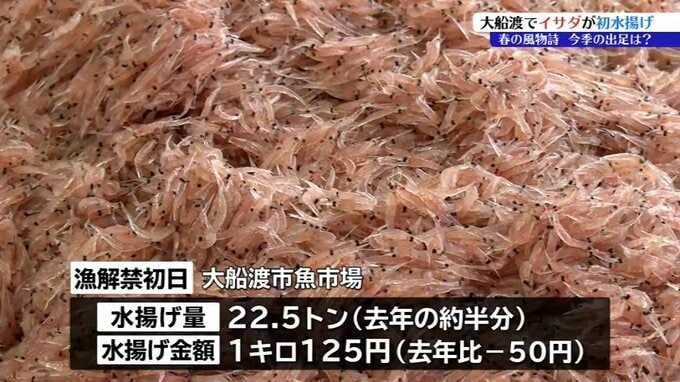 初日は2025年のおよそ半分の22.5トンの水揚げにとどまった一方、金額は1キロ当たり125円と50円ほど安い値が付けられました。